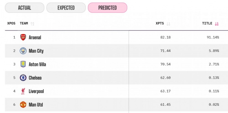 2月6日讯 截止目前本赛季英超联赛共进行了24轮联赛,opta对本赛季的夺冠概率进行了最新预测,阿森纳高达91.14%。